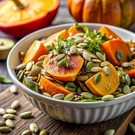 ताजे एवोकाडो और सब्जियों के साथ नरम कद्दू के बीज मिलकर एक सुगंधित और पौष्टिक ताजगी प्रदान करते हैं।
